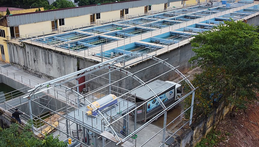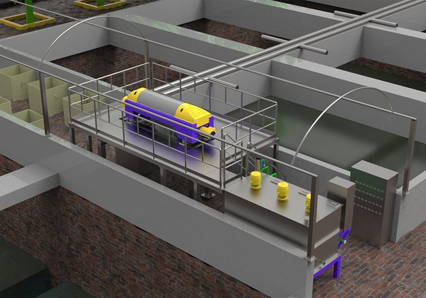 A 3D rendering, describe the machine installation position in the sludge treatment system