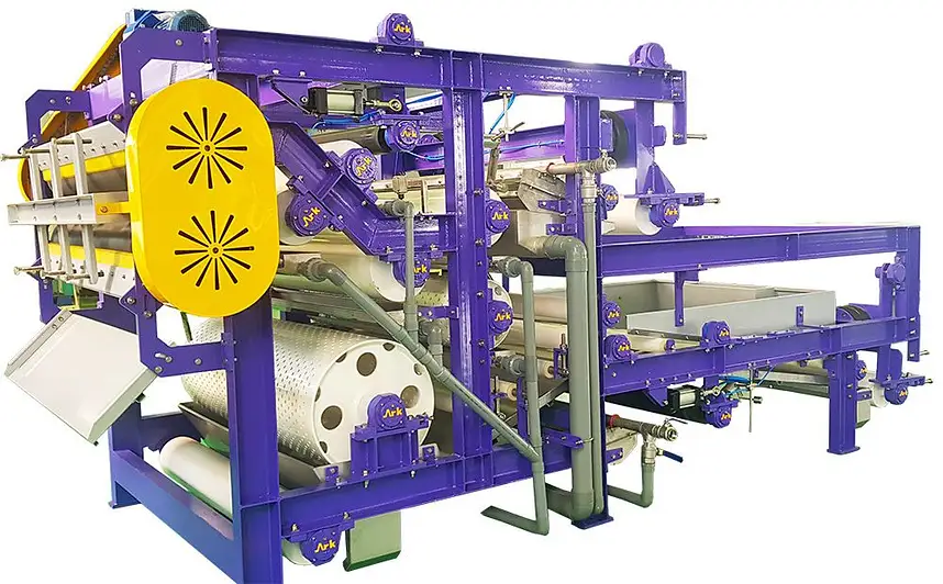 เครื่องอัดตะกอนแบบสายพานของ ARK ใช้งานง่ายและทำความสะอาดง่าย เครื่องจักรมีลูกกลิ้งอัดตะกอนมากกว่าผลิตภัณฑ์ที่คล้ายกันในตลาด นอกจากนี้ เครื่องจักรยังมีลูกกลิ้งขนาดใหญ่ที่มีรูระบายน้ำ ซึ่งช่วยเพิ่มเวลาในการอัดตะกอนและความสามารถในการแยกน้ำออก
